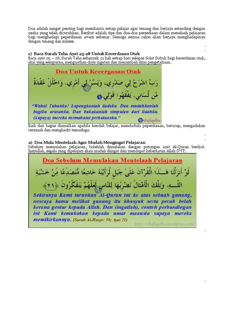 Doa Apabila Terlupa Ketika Menjawab Soalan Doa Ibubapa Untuk Anak Sedang Menghadapi Peperiksaan Doa Jika Anda Terlupa Jawapan Doa Ketika Memasuki Dewan Peperiksaan Doa Ketika Sukar Buntu Menjawab Soalan Doa Memohon Kejayaan Cemerlang Doa Memulakan Ulangkaji Pelajaran Doa Mudah Kefahaman Ingat Doa Mudah Mengingat. اللهم اجعل لساني عامرا بذكرك. Doa untuk memulakan ulangkaji pelajaran.